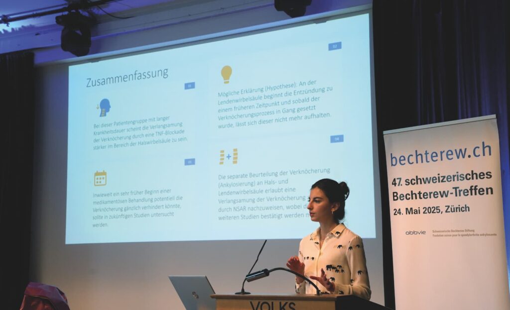Dans l’ensemble, de nombreux paramètres de la spondylarthrite, mesurés à l’occasion d’une expertise, ne s’aggravent pas chez les patients longue durée. L’état de santé semble se stabiliser après plusieurs années de maladie. N’oublions pas que  la spondylarthrite a une influence sur la vie professionnelle. Ainsi, cette étude a révélé que la part de personnes actives professionnellement est de 30% inférieure à celle de l’ensemble de la population. Il ne faut pas hésiter à prendre au plus tôt – c’est-à-dire, au stade précoce de la maladie – les mesures qui permettront de lutter efficacement contre une mauvaise évolution de celle-ci.